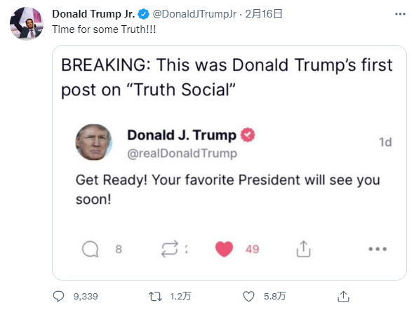 2月15日,特朗普的长子小唐纳德在推特上发了一张他父亲的@realDonaldTrump Truth Social账号于2月14日所发的一条推文的截图:“准备好!你们最喜欢的总统很快就要和你们见面了!”