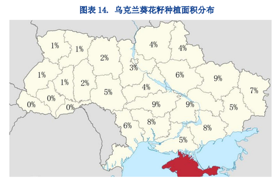 葵花籽产区主要集中于南部与东部地区,顿涅茨克与卢甘斯克合计占比12%,占比较高,相对影响预计较大。乌克兰葵花籽基本在国内压榨,并出口葵花粕与葵花油,并非直接出口葵花籽。