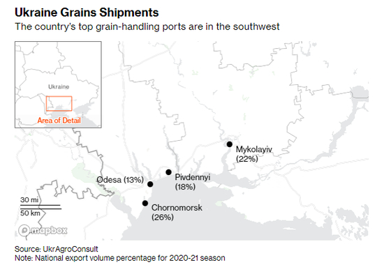 在农业出口基础设施方面,港口分布在亚速海沿岸和更西边的黑海沿岸。研究机构UkrAgroConsult的数据显示,乌克兰西南部的港口敖德萨(Odesa)、皮夫登尼(Pivdennyi)、米科拉伊夫(Mykolayiv)和切诺莫尔斯克(Chornomorsk)承载着乌克兰近80%的粮食出口。大约5%的货物由马里乌波尔(Mariupol)和别尔代扬斯克(Berdyansk)的亚速港口出口。马里乌波尔位于顿涅茨克地区。