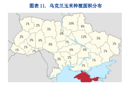 玉米产区主要集中于中部地区,围绕第聂伯河两岸分布相对分散,顿涅茨克与卢甘斯克合计占比仅 2%。
