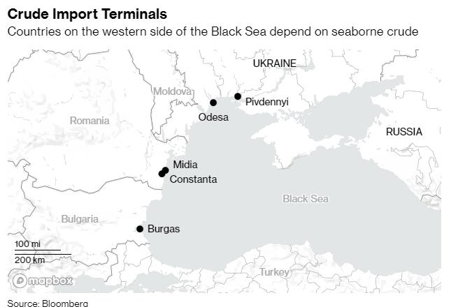 罗马尼亚和保加利亚都通过黑海沿岸的码头进口原油。每天大约有20万桶石油从东向西穿过黑海,另外还有更多的石油通过博斯普鲁斯海峡从地中海进口。