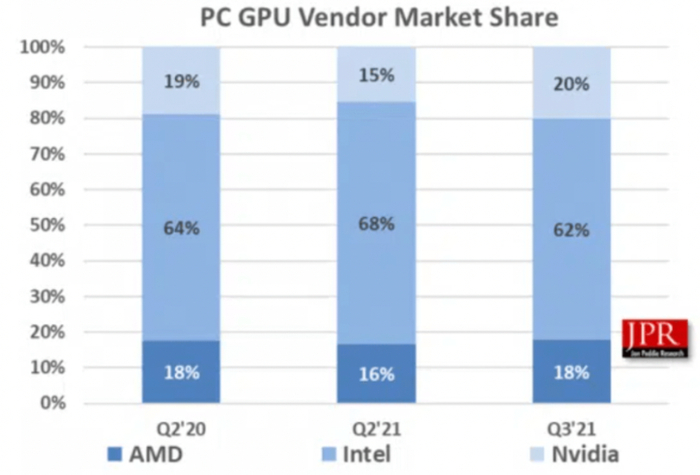 NVIDIA 是全球第二大 GPU 供应商,拥有 20% 的市场份额,紧随其后的是 AMD ( AMD ),占 18%,英特尔 ( INTC ) 以 62% 的市场份额领先。