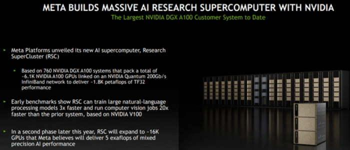 该公司是宣布与 NVIDIA建立人工智能研究超级集群的 Meta ( FB )(前身为 Facebook)的骨干。这有可能为一群人提供令人惊叹的技术,例如实时语音翻译,即使他们每个人都说不同的语言。这将使他们能够轻松地在项目上协作或在元界中一起玩 AR 游戏。