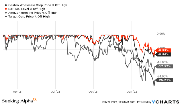 虽然其他零售商 - 如Target(TGT)或亚马逊(AMZN) - 在过去几个月中下跌幅度更大,但Costco的交易价格仍然非常接近其历史高点,在过去几周的调整期间,它下跌了与标准普尔500指数(SPY)相似的下跌 - 这令人惊讶。
