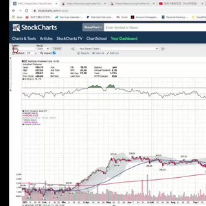 2.NOC。主要是提供B—21隐形轰炸机,包括无人机,这家公司也是几大军火制造商之一,韦伯望远镜其实也是这家公司做的。前面我们讲到过对冲的话题,我们第一次进场是在369,到财报之前,正好到历史高点进行双层底结构,很容易控制,这个地方大家应该是hedge。hedge完了以后,在这个地方没有再继续下跌,再往上走的时候,我们第二次进场是376。也就是说这只股票其实在战事爆发之前是上行,是一个很小的consolidation,借着这个战事直接突破出去,最近两周也是大幅上涨。礼拜五的时候已经到了第一目标位450左右,礼拜五我们还要进场,它尽管涨得很高,但实际上目前从技术形态测量上来讲,达到第一目标位、第二目标位大概在500左右,还可以继续去关注。