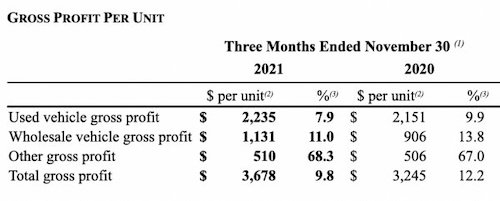 我们在11月的CarMax 10-Q中看到了这一点。由于批发贡献,CarMax每零售单位的毛利润为3,678美元,而不是只有2,547美元:
