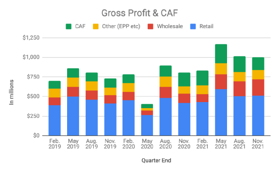 CarMax的毛利润和CarMax汽车金融(“CAF”)数据在过去三个季度都有很好的增长: