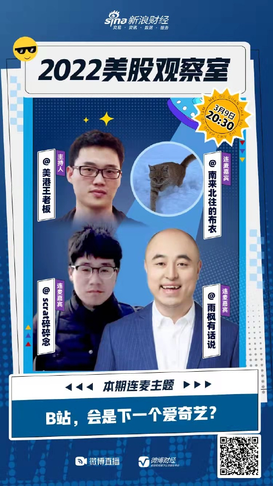 3月9日周三晚间20:40,主持人@美港王老板 连麦财经大V@scart、@雨枫有话说、@南来北往的布衣。讨论主题:B站,会是下一个爱奇艺?