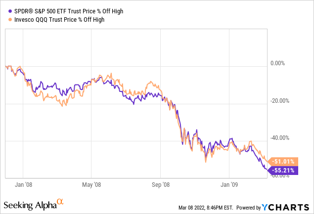 如果我们回顾一些股票市场的历史,我们经历的时代比我们今天生活的时代要可怕得多。以 2008 年全球金融危机为例,两个指数均下跌超过 50%: