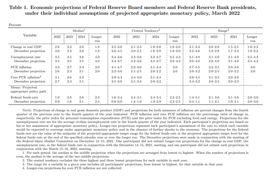 图1:Economie projections of Federal Reserve Bourd members and Federal Reserve Bank presidents,under their individual assumptions of projected appropriate monetary policy, March 2022