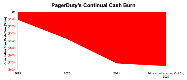 从 2019 财年到 2021 财年,PagerDuty在FCF中累计消耗了7.12亿美元(占市值的26%)。在截至 2021 年 10 月 31 日的九个月中,PagerDuty 又消耗了 3500 万美元的自由现金流。下图说明了 PagerDuty 持续的现金消耗。