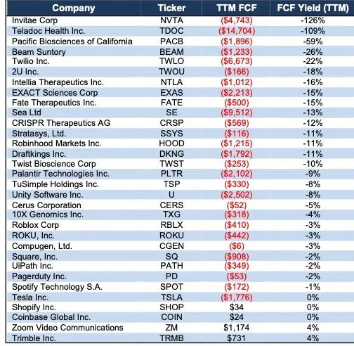 图 1 显示,在我们覆盖的 32 家 ARKK 持股中,有 28 家在过去 12 个月产生了负的自由现金流和负的 FCF 收益率。ARKK 目前持有另外六只不在我们覆盖范围内的股票。