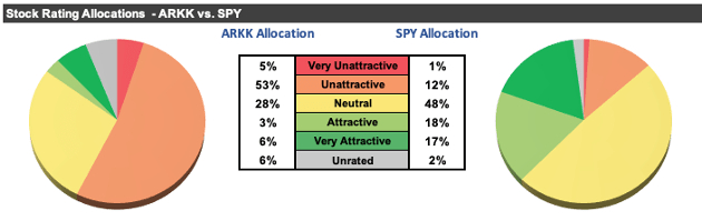 根据下图,ARKK 将其投资组合的 58% 分配给评级不具吸引力或更差的股票,而 QQQ 仅占 9%。同时,ARKK 对具有吸引力或更高评级的股票的敞口要低得多,为 9%,而 QQQ 为 29%。
