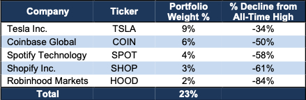 我们专注于可量化的基本基准,而不是仅仅使用定性研究和华而不实的卖点,已经导致我们将 ARKK 的 5 个持股(占投资组合的 23%)置于危险区。