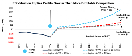 下图将 PagerDuty 在这三种情况下隐含的未来 NOPAT 与其历史 NOPAT 进行了比较: