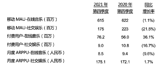 · 2021年第四季度,得益于公司持续拓展的营销渠道、高质量的音乐内容与服务和忠诚的核心用户群体,公司在线音乐付费用户继续实现强劲的同比和环比增长,创下7620万的历史新高,尽管部分轻度用户短暂流失至其他泛娱乐平台导致公司在线音乐MAU同比下降了1%。