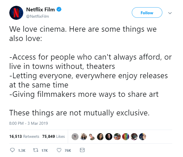 Netflix也不点名地公开回击斯皮尔伯格,“我们热爱电影,但我们也热爱以下几点:让那些无法负担或是住所没有电影院的人看电影,让所有人在任何地方同时欣赏电影,让电影制作者有更多方式分享艺术。这几点并不是彼此对立的。”