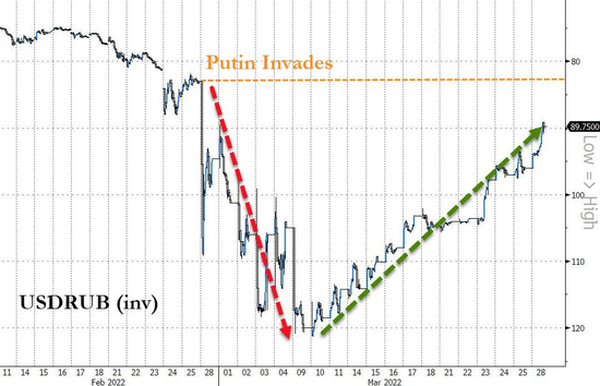 这也导致了卢布兑美元疯狂升值;在俄乌周二谈判进展出炉之前,卢布已开始走强。