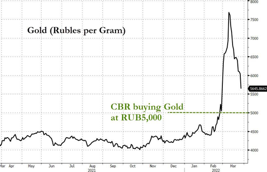 俄罗斯银行现在以5000卢布1克或15.55万卢布1盎司的价格购买黄金。如果按照100卢布兑1美元的汇下,5000卢布兑1克黄金意味着每盎司黄金价格为1550美元,这远低于当时的金价(1950美元左右)。