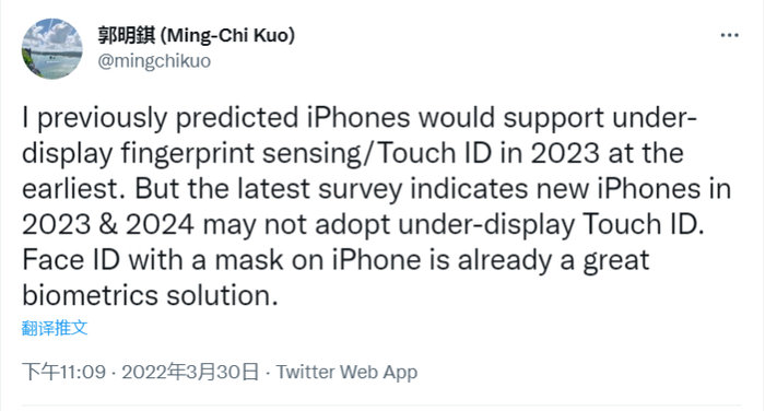 品玩3月30日讯,郭明錤表示,“我之前预测 iPhone 最早会在 2023 年支持屏下指纹识别 / Touch ID。但最新调查显示,2023 年和 2024 年的新 iPhone 可能不会采用屏下 Touch ID。iPhone 上支持戴口罩的 Face ID 已经是一个很好的生物识别技术解决方案。”