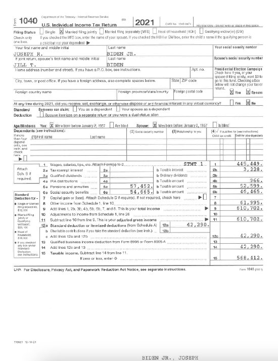 拜登夫妇公布2021年税单:年收入逾61万美元
