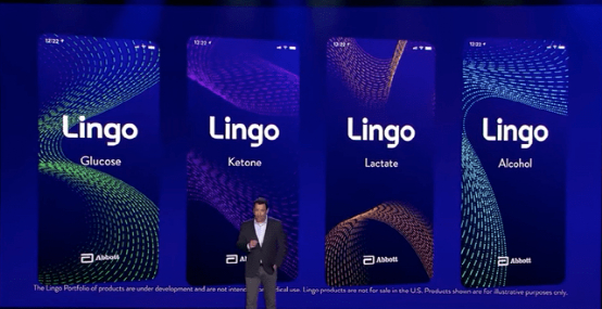雅培正在努力成为其下一个重要产品的几款内部开发产品之一被命名为 Lingo。它将扩展 Freestyle Libre,不仅可以测量葡萄糖水平,还可以测量酮、乳酸和酒精。福特 CEO 福特在 01/2022 的 CES 上雅培的扩展演示中大张旗鼓地介绍了它,如下图所示: