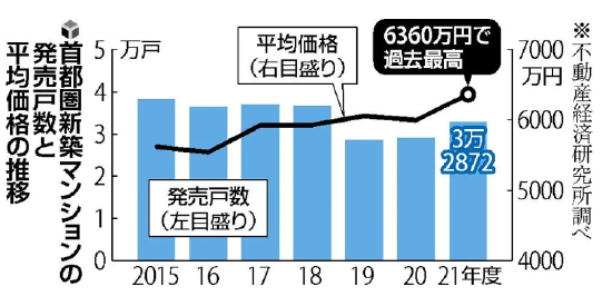 日本不动产经济研究所称,2021年在首都圈发售的新建公寓,每户的平均价格为6360万日元(约316万元人民币)。该价格超过了日本1990年泡沫经济时期的平均房价6214万日元,创下了最高纪录。