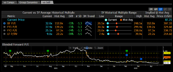 就估值而言,与大多数高增长公司一样,Upstart的估值倍数自去年11月达到峰值以来已经大幅下降,现在的估值更加合理。在巅峰时期,Upstart的预期市盈率超过200倍,而目前的预期市盈率约为32倍,如下图所示。