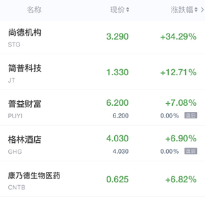 尚德机构涨超34%,瑞幸粉单涨超10%,36氪涨超4%,满帮涨超3%,理想汽车涨超2%,携程涨近2%,雾芯科技、中通、极光涨超1%。