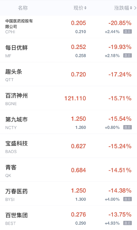 每日优鲜跌近20%,趣头条跌超17%,第九城市跌超15%,青客跌超14%,百世集团跌超13%,爱奇艺、金山云跌近12%,一起教育、乐居跌超11%,波奇宠物、嘉楠科技超跌10%,网易有道跌近10%,凤凰新媒体、寺库、小牛电动跌超9%,叮咚买菜跌近9%,斗鱼、微美全息、新氧跌超8%,达达集团、迅雷、途牛跌超6%,蔚来汽车、老虎证券、云米科技、BOSS直聘跌超5%,拼多多跌近5%,虎牙、房天下、知乎、名创优品跌超4%,开心汽车跌近4%,阿里巴巴、京东、欢聚集团、水滴公司、优信跌超3%,腾讯音乐跌近3%,小鹏汽车、贝壳、蘑菇街跌超2%,百度、哔哩哔哩、新东方跌超1%。