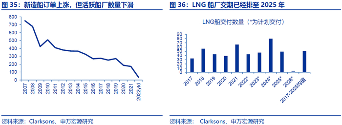 新造船产能紧张,头部船厂船台已经排至2025年。虽然新造船价格上涨,但上一轮造船周期产能出清较为充分,中日韩造船工程师红利结束,造船产业集群难以恢复,活跃船厂数量持续下滑,新增产能有限。