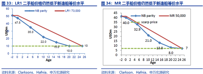 二手船油轮性价比仍高于新船,成品油新船订单中期难以增加。从新造船等价(NBParity)和二手船价格指标来看,虽然LR1、MR油轮二手船价格持续上涨,但仍然低于当前新造船价格按同样船龄估算折旧后的价格,在这种背景下,船东购买二手船优先级高于新船。