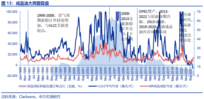 需求端:成品油需求端与原油库存周期联动,相关性较强,VLCC运价水平与MR具有一定关联性供给端联动:LR2、LR1成品油轮在油轮景气周期可以承运原油,但原油轮除了首航以外无法承运成品油。原油轮运价相比同等大小成品油轮溢价较高时比如2015、2008年,部分成品油轮会承运原油,进一步导致成品油轮供给下降,从而实现供给端的传导。船厂端,航运各船型共享船厂产能,集装箱及LNG高景气导致其他船型中远期供给受限,实现景气度传导。俄乌冲突以来,由于欧洲港口停靠大型油轮能力有限,中小型油轮先于VLCC景气度反转供给为航运最大的敌人,2008年,新船订单占运力比达到60%,开启了长周期下行,经历13年,当前新船订单占比仅4-5%创有数据统计以来新低