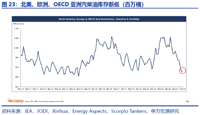 “库存角度,OECD亚洲、北美、欧洲汽柴油库存处于2010年以来新低,潜在补库存空间充足。”