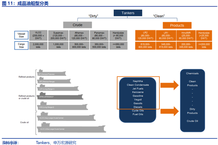 申万宏源闫海团队指出,成品油轮主要用作承运石脑油、航空煤油、汽柴油等成品油。根据大小,成品油轮主要分为以下三类: