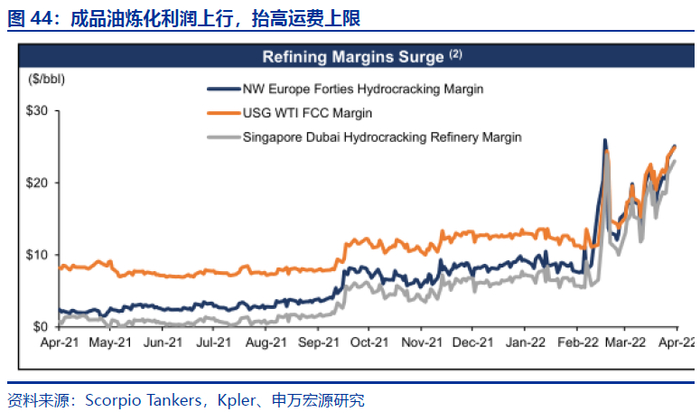“2018年以来,成品油平均运距从2800海里提升至2021年的3097海里,受俄乌冲突影响2022 2023有望提升至3340海里以上。”