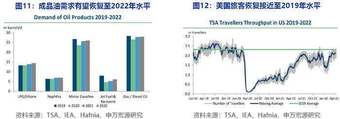 申万宏源闫海团队指出,成品油消费与出行需求相关,参考美国TSA数据,游客水平已经恢复接近至2019年。主要成品油消费也有希望修复回19年水平。