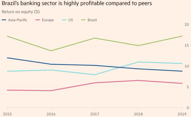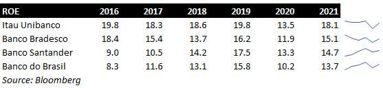 四大银行:Itau Unibanco、Banco Santander、Banco Bradesco 和 Banco do Brasil 的平均股本回报率 (ROE) 远高于全球同行。