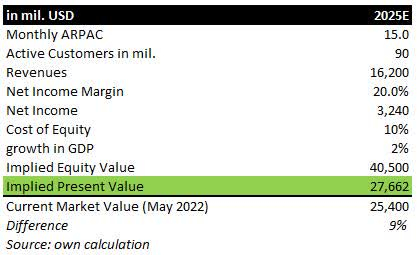 应用巴西银行业超过 20% 的平均净息差,Nubank 可赚取超过 32 亿美元的净收入。有了这些投入,Nubank 的隐含现值约为 280 亿美元,比当前市场价值高出约 9%。9% 的差异似乎不大,但如果计算中使用的某些输入不正确,这是一个合理的安全边际。
