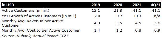 另一方面,越来越多的客户对客户获取成本产生积极影响,随着越来越多的人熟悉品牌和产品,客户获取成本正在下降。Nubank 可以实现有利的单位经济效益,因为它正在扩大规模并增加其活跃客户的数量。每个客户的平均收入与每个客户的平均成本之间的差距随着时间的推移而增长,并且与越来越多的活跃客户呈正相关。