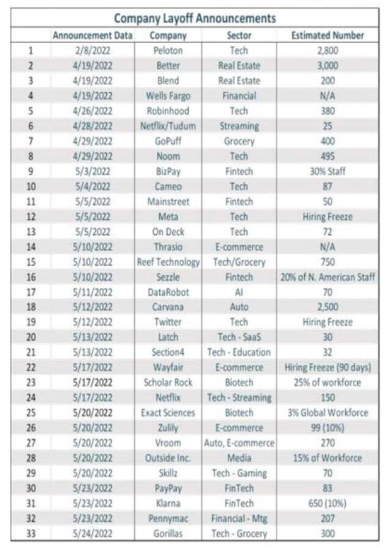 把时间调回现在,初请失业金人数在今年3月达到数十年低位后持续上升。在利润出现历史性收缩之际,多家公司宣布将执行裁员计划,或是冻结招聘。下图为美国投行Piper Sandler汇总的,最近所有发布大规模裁员公告的公司。美国公司裁员潮规模之大令人惊掉下巴。