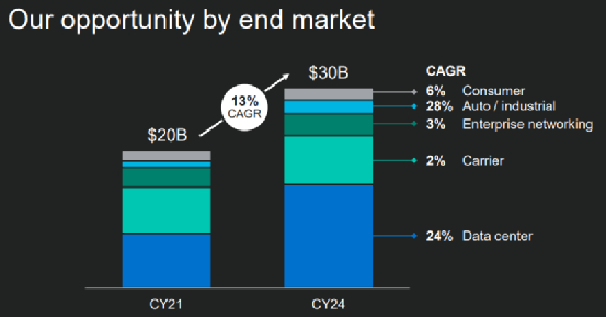 该公司的业务分为五个终端市场,即数据中心、运营商基础设施、企业网络、消费者和汽车/工业。
