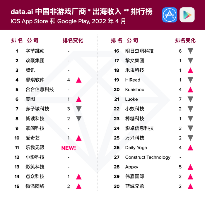 data.ai 4 月中国非游戏厂商及应用出海收入榜显示,欢聚集团及其BIGO LIVE应用持续稳居厂商和应用双榜第二,Likee排名前十,Hago排名前30。