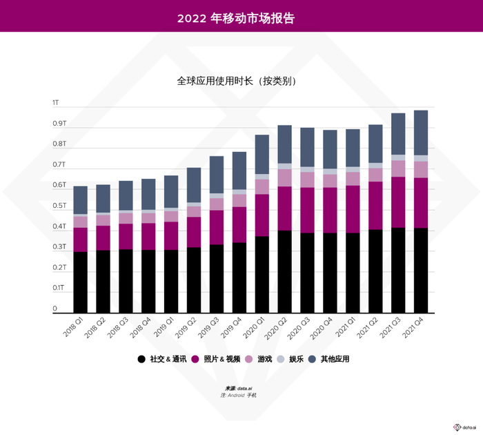 值得一提的是,社交正与音视频前所未有地融合在一起。data.ai 发布的《2022 年移动市场报告》显示,2021年,用户有70%的时间花在了社交与照片、视频应用上。