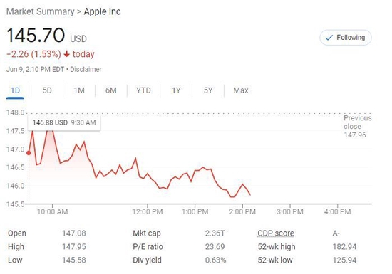 尽管有诸多新产品等待上市的消息,苹果股价在周四美股午盘时维持逾1.5%的跌幅,追随美股大盘震荡走低的态势。苹果已完全回吐了周一WWDC重磅硬件和软件发布以来的全部涨幅。