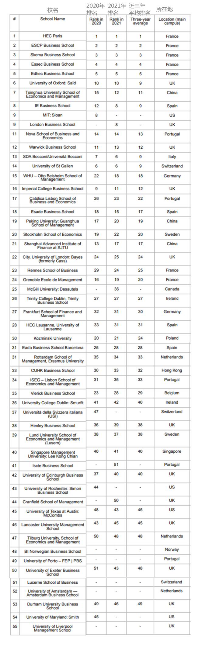 《金融时报》(Financial Times)2022年全球金融硕士(无工作经验要求类别)排行榜完整榜单: