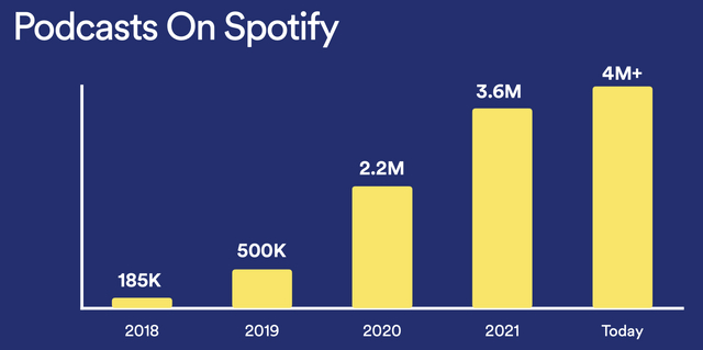 在他们的投资者日,Spotify 管理层披露了几个指标,证明了他们的播客部门的惊人增长。在 2018 年 4 月直接上市时,Spotify 几乎没有出现在播客中,但在 2021 年底迅速增长,超过了苹果播客 ( AAPL ),成为美国市场上最受欢迎的播客平台。