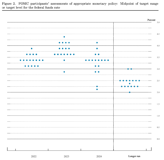 2022、2023、2024年底联邦基金利率预期中值分别为3.4%,3.8%,3.4%,3月预期分别为1.9%,2.8%,2.8%。