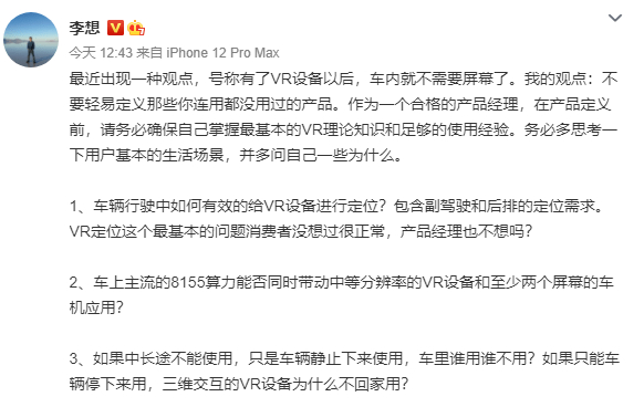 或许是认为李斌的话语中暗指了自己旗下的产品,李想在ET5发布会后,很快在其微博中反击道:“最近有种观点,号称有了VR设备后,车内就不需要屏幕了”“不要轻易定义那些你连用都没用过的产品”,此外李想还罗列了VR设备的一些注意事项,一时间火药味十足。