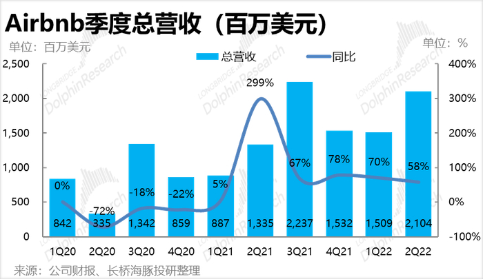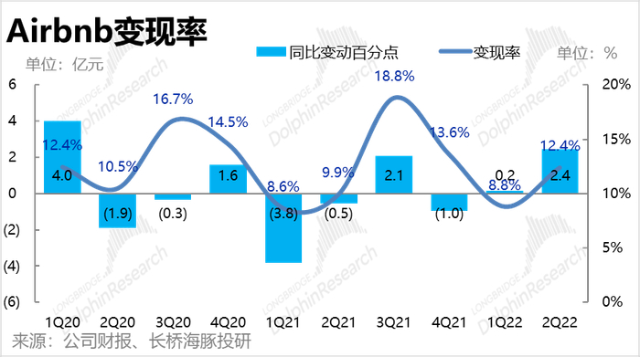 由于价量对冲后,本季 Airbnb 的GBV与预期基本一致,公司在营收端的表现也完全在市场的预期中。具体来看,公司本季实现收入21.04亿元,市场预期则是20.95亿元。不过在变现率提升的驱动下,本季营收增速仍达58%,增速虽略有放缓,但仍在高速增长期。